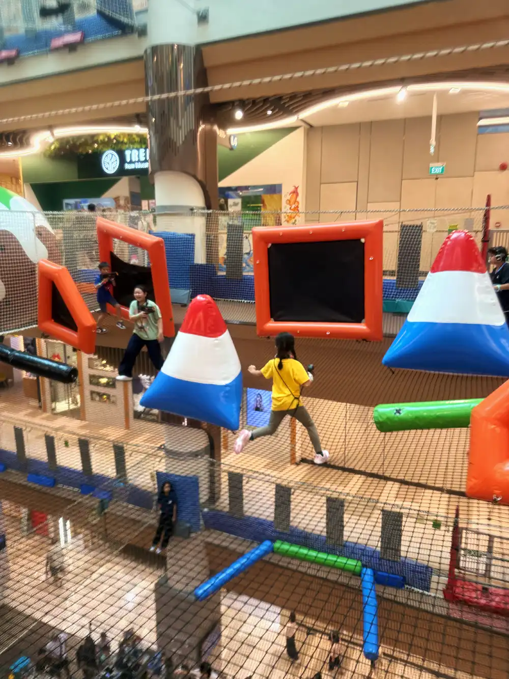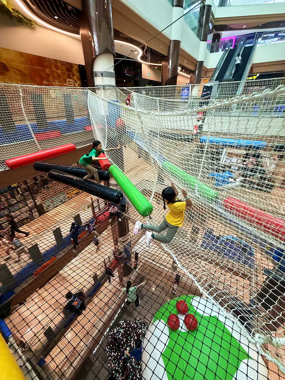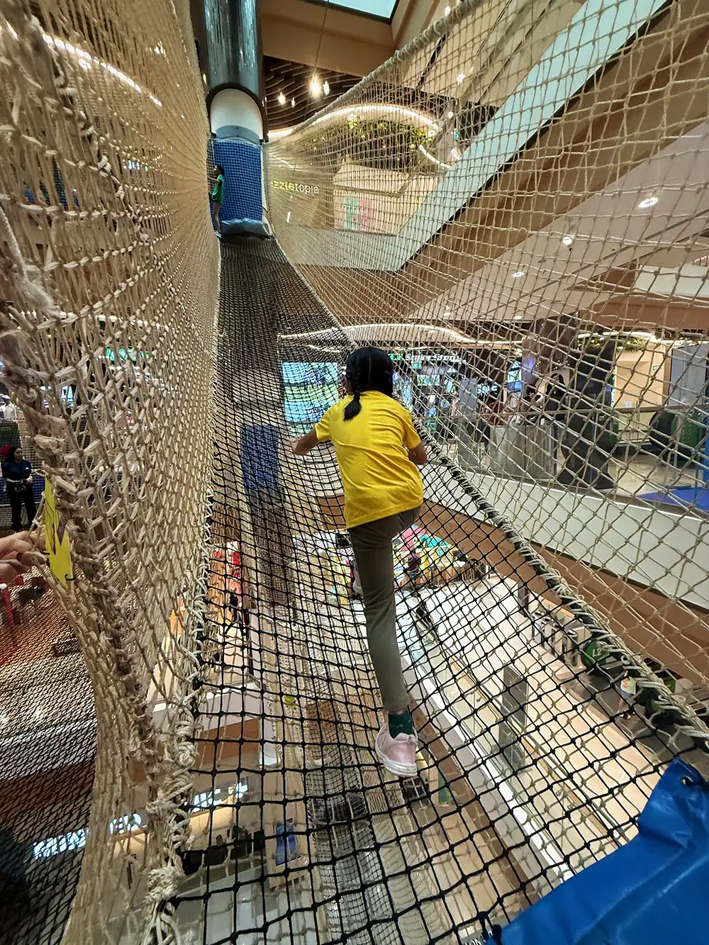 Airzone brings that experience to life at City Square Mall, where suspended nets stretch across levels 2 to 6, creating one of Singapore's most unusual indoor playgrounds.