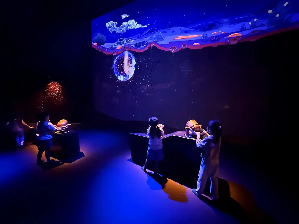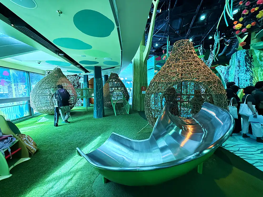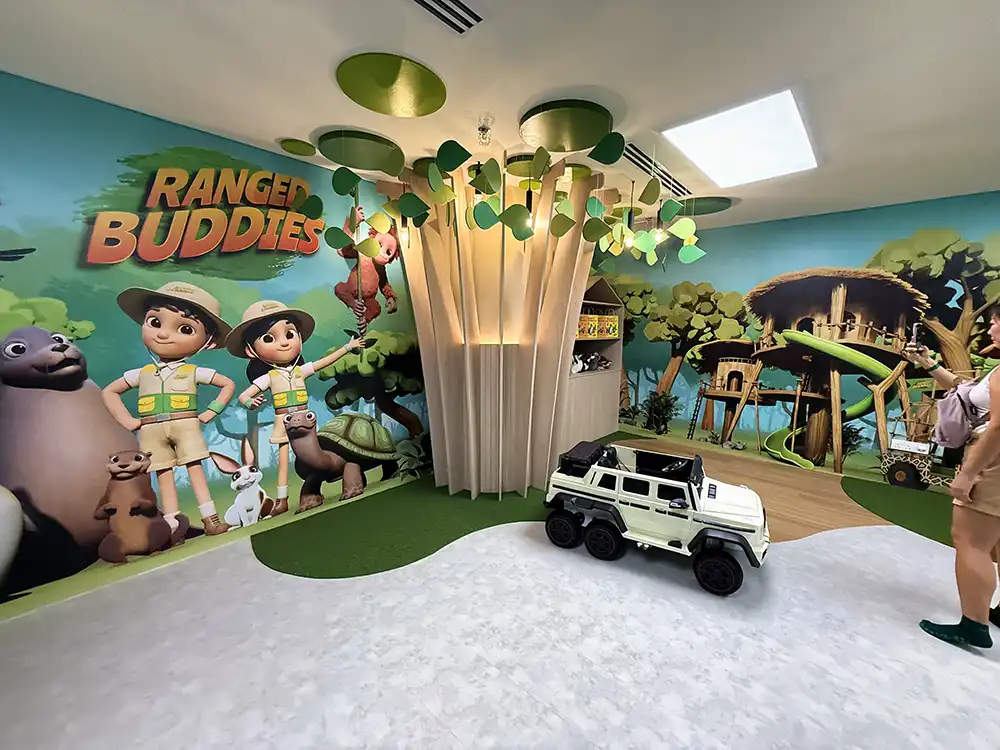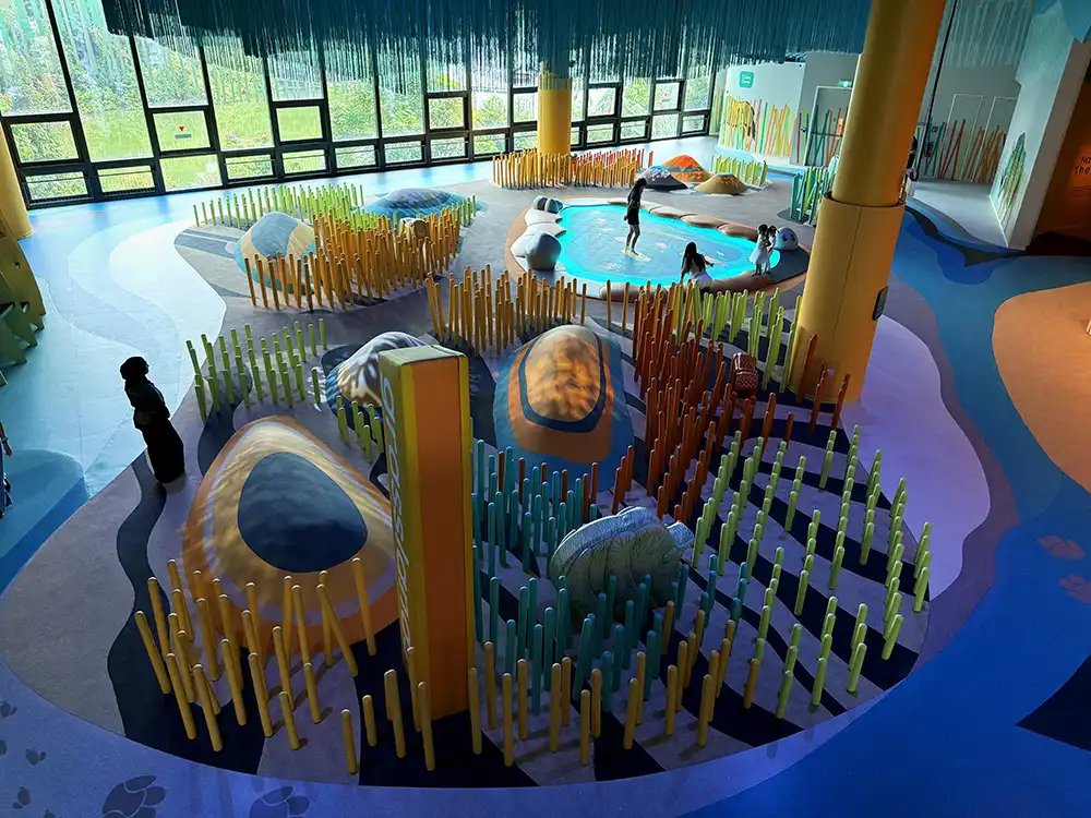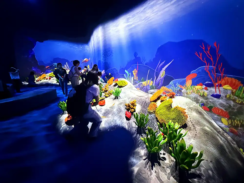 The Reef Retreat is particularly magical as marine life comes alive beneath shimmering blue light, giving kids a glimpse into the underwater world without getting wet.
