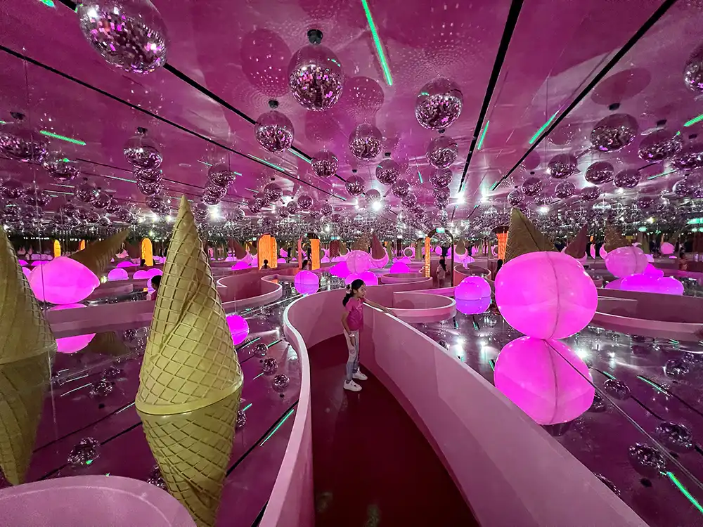 Colourful lights and endless reflections create a mesmerizing atmosphere.