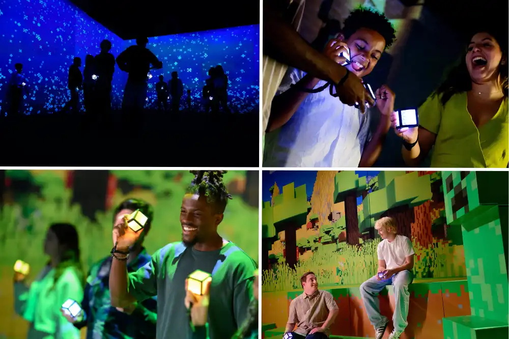Move through eight immersive rooms inspired by familiar Minecraft biomes, including forests and iconic landscapes from the game.