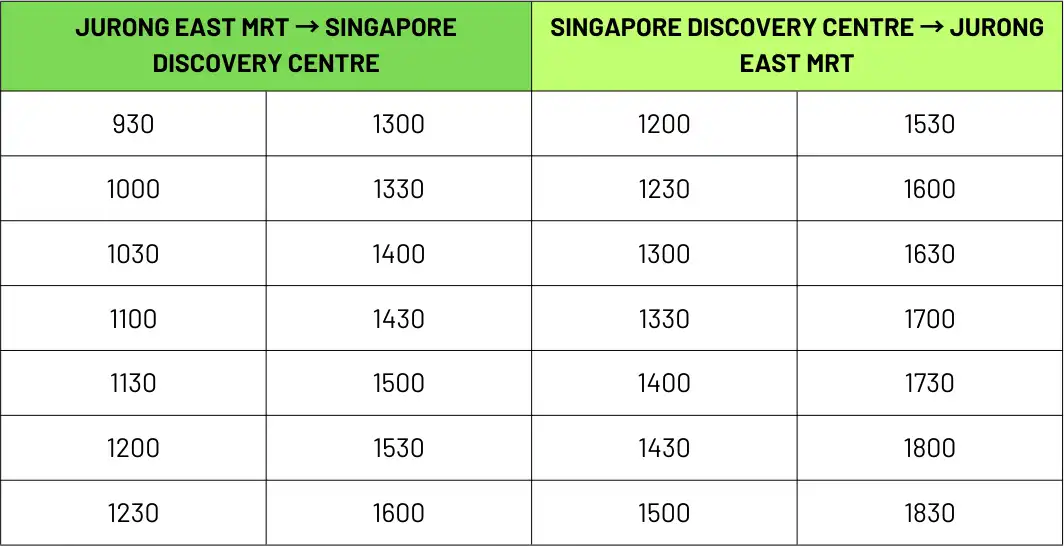 Take advantage of the complimentary shuttle buses running between Singapore Discovery Centre, Singapore Navy Museum, and Singapore Air Force Museum at one-hour intervals.