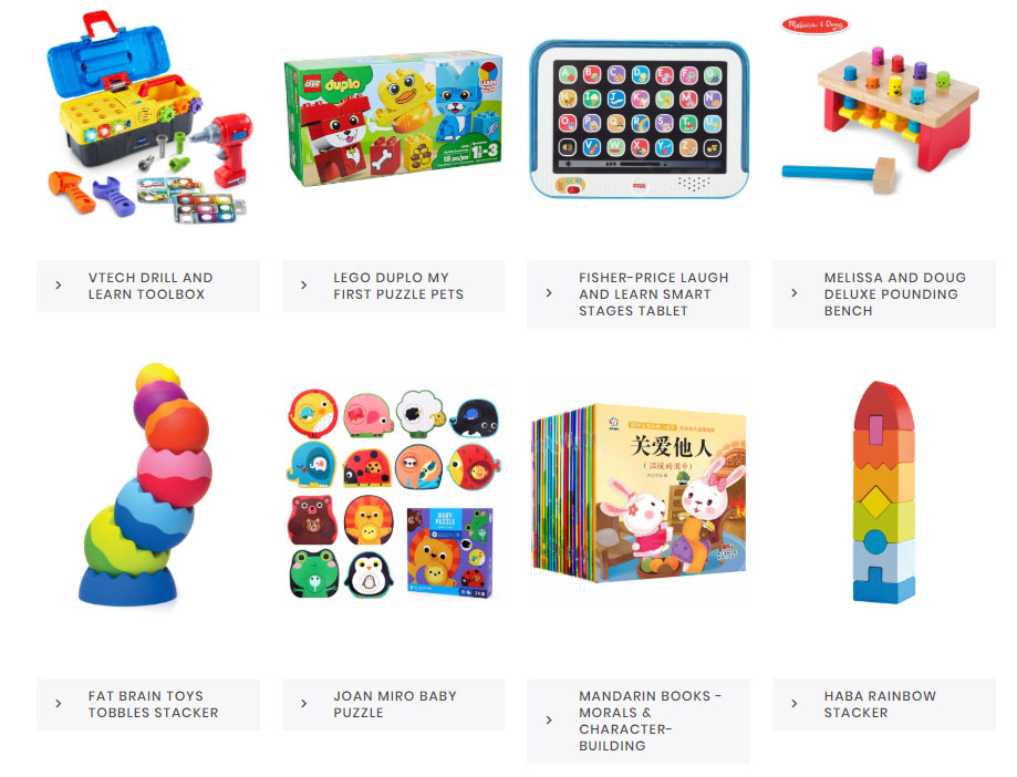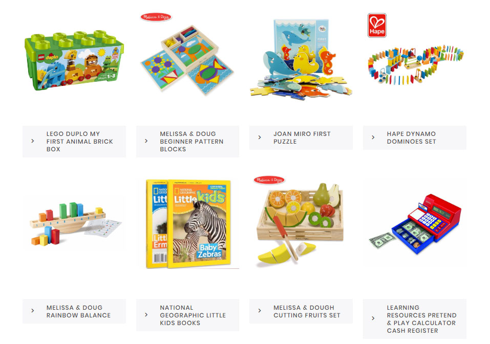 2. Every month, 4-6 educational toys, books, and materials will be delivered right to your doorstep. You are guaranteed to get $120-$150 worth of toys and books in each box. The toys are also from quality brands such as Melissa & Doug, VTech, Fisher-Price, and Hape. There will even be one toy that is yours to keep!